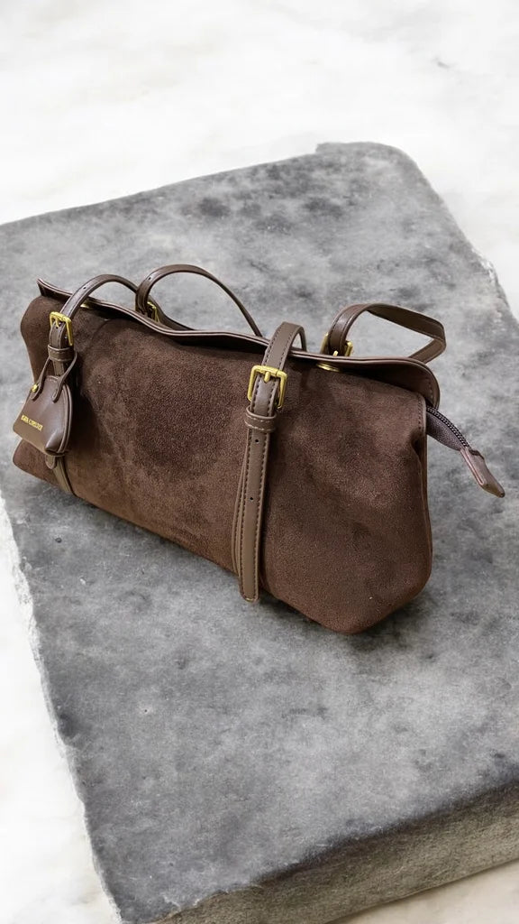 Borsa Brown in Ecocamoscio con chiusura cerniera e bottoni.