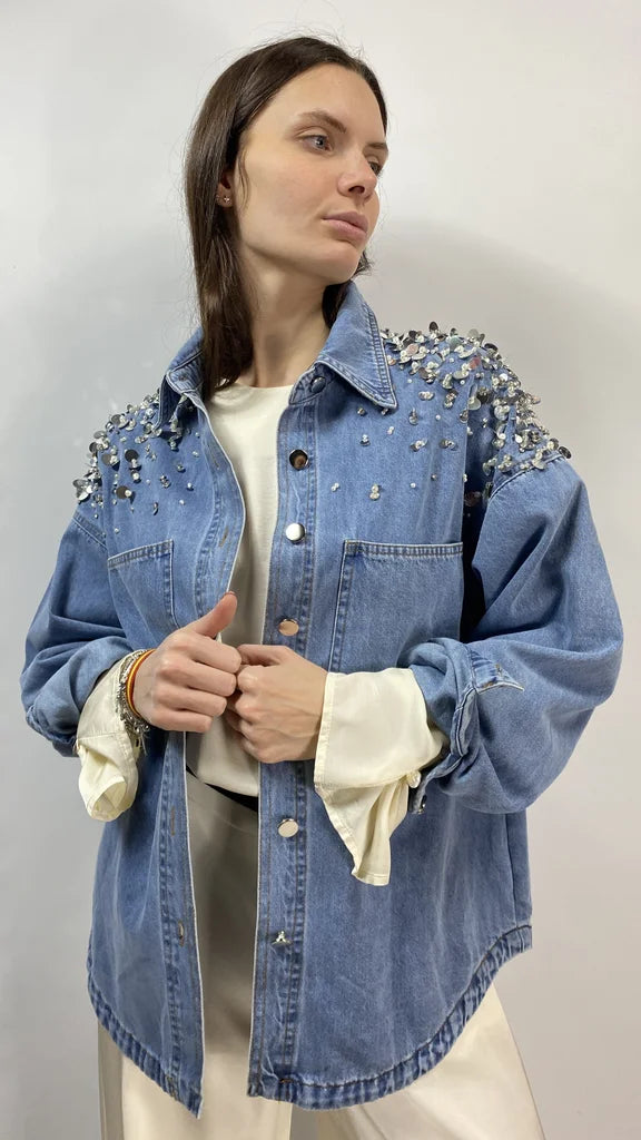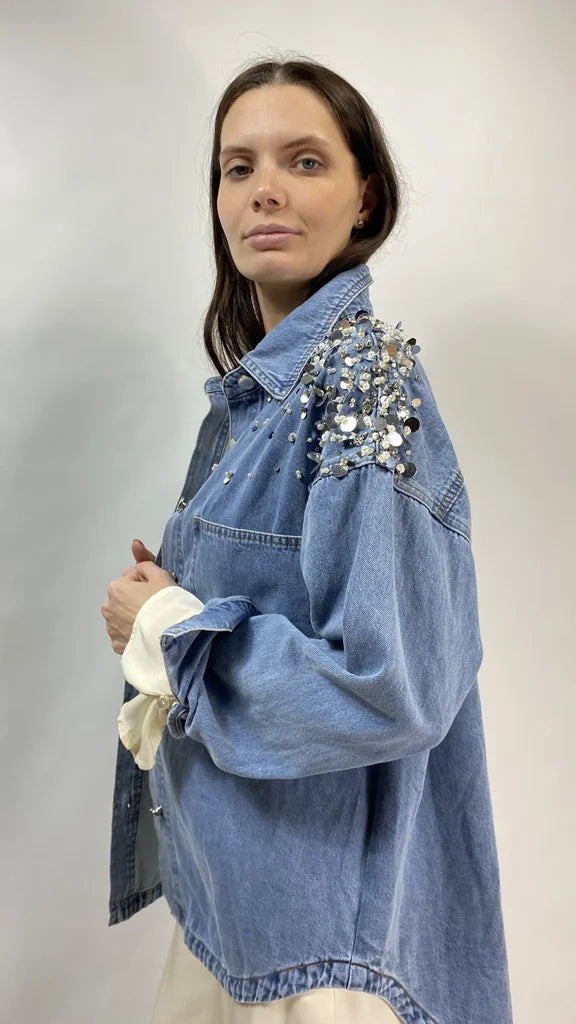 Camicia Prince in tessuto Jeans. Dettaglio applicazioni sulle spalle.