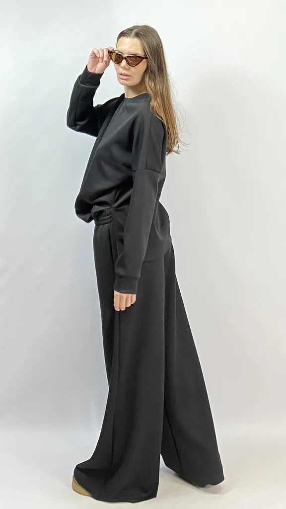 Completo Comfy composto da felpa girocollo e pantalone a palazzo con elastico in vita . La modella è alta 165 cm