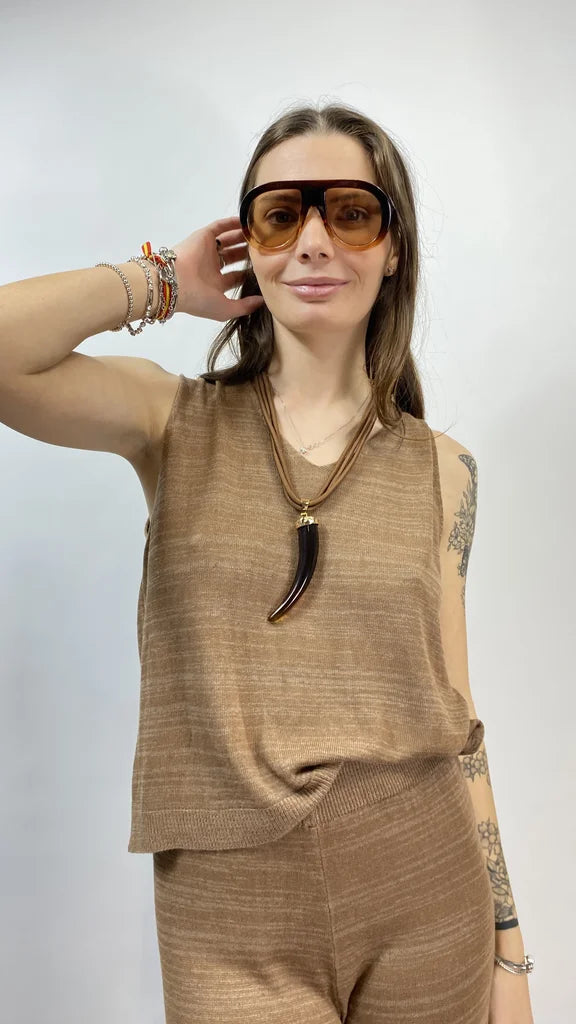 Top 1253 in maglia con scollo a V. La modella è una Tg 40 e indossa la Tg S/M.